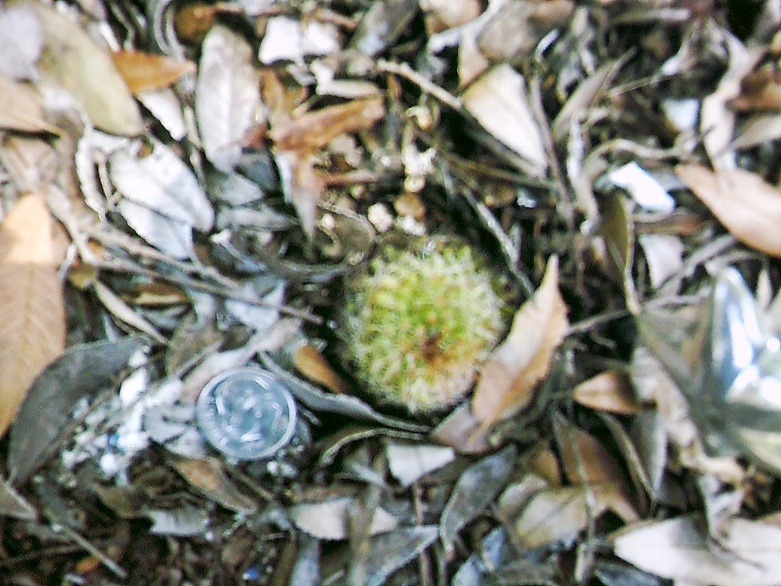 I stood on the sidewalk to take the photo above, but when I decided to photograph two more little barrels, I had to step right into the bed. This I did gingerly though I was wearing sturdy shoes, and indeed I almost stepped on a barrel that had successfully hidden from us for over a year. Growing less than two feet from the 'big' barrel, it looks to be a younger specimen of the same variety: