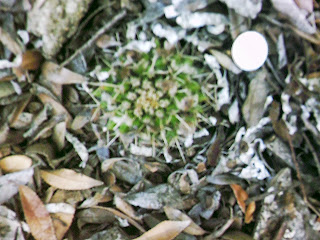 Desert living does not appeal to me, but I do enjoy cacti and can grow them easily in our Mediterranean climate. Not long after Steve and I established the cactus and succulent bed in our front garden, I set out several small cacti which had been growing in pots for years. This may have been a mistake, as some of them were so tiny that we lost track of where they were. Here's a photo of the biggest one, a barrel cactus, with a dime at eleven o'clock to indicate scale: