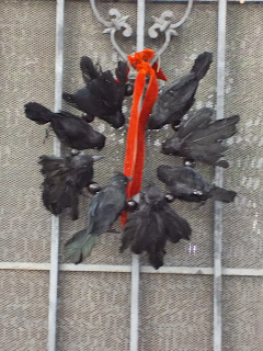 Steve hates the noisy black crows that fly through our neighborhood most late afternoons and early evenings, often terrorizing smaller birds. He will sit at the bistro table in our front garden and fantasize about ways to kill them. Like, a water cannon. And so I knew that hanging some black bird effigies on our front door would appeal to him.