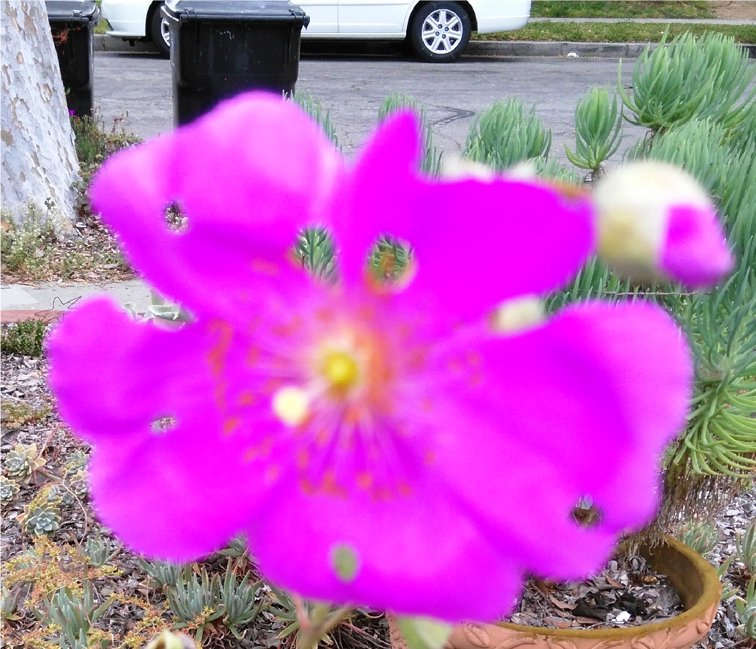 Meanwhile C1 was reaching for the top of my neighbor's fence. This fence, which starts where our chain link fence stops, runs along the south side of our property. Her ex-husband built it at least 20 years ago out of wooden two-by-fours resting on the concrete walkway to their back yard. He finished the fence on their side with a stucco covering painted to match their house Because we wanted to grow vines on our side, we covered it with white plastic trellis through which we can see some termite damage which, though it has been treated by an exterminator, has weakened the fence to a certain extent.