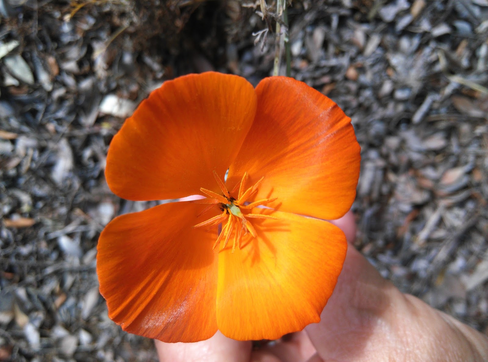 Meanwhile, the previous four blossoms had produced mature seedpods, and I started thinking about how best to ensure a good crop of poppies for 2016. It shouldn't be difficult, with the strong possibility of a rainy El NiƱo season ahead. I decided to pick two pods and scatter their seeds, and leave two to scatter their own seeds naturally. Here are the harvested two: