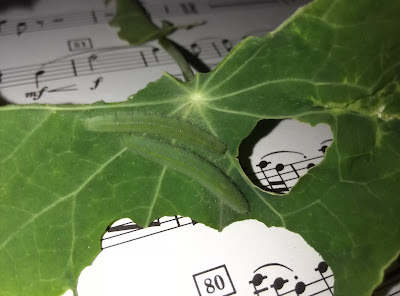 Though it shows oregano, tarragon, and marjoram to good advantage, I do not like this photo. The sun was so bright that all I could see on the screen of my smart phone was my own reflection. I showed the worms and the photo to Steve, and he wisely offered a solution: "Why don't you take off the leaf?" Why, indeed? So I carried the leaf and its little sunbathers inside and placed them on a piece of band music. What a lovely setting: