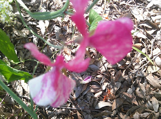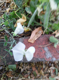 The upper image shows STREAKING of bright pink on white (or vice versa), and the lower one shows the WHITEST petals I've seen on volunteer sweet peas. Plain bright pink blossoms have appeared every year, and there have been plenty of light pink with white, but none where the white part of the petal has predominated. If I were a more dedicated follower of Gregor Mendel, I would save seed from these two to see what they would do next year, but it's more fun to wait and be surprised.